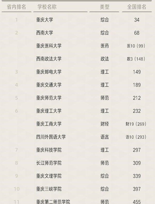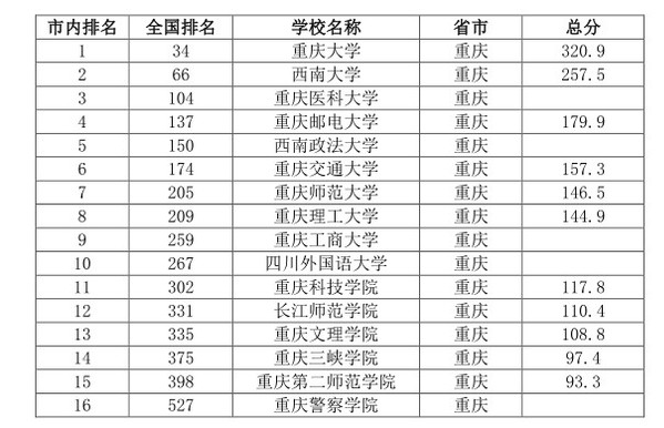 “2020软科中国大学排名”(主榜)重庆高校排行榜 (图片来源:软科)