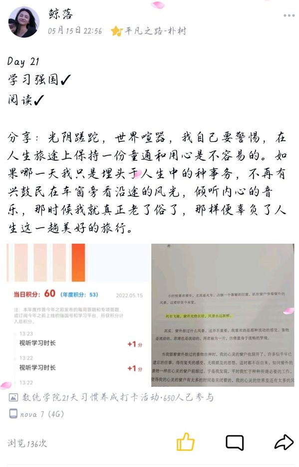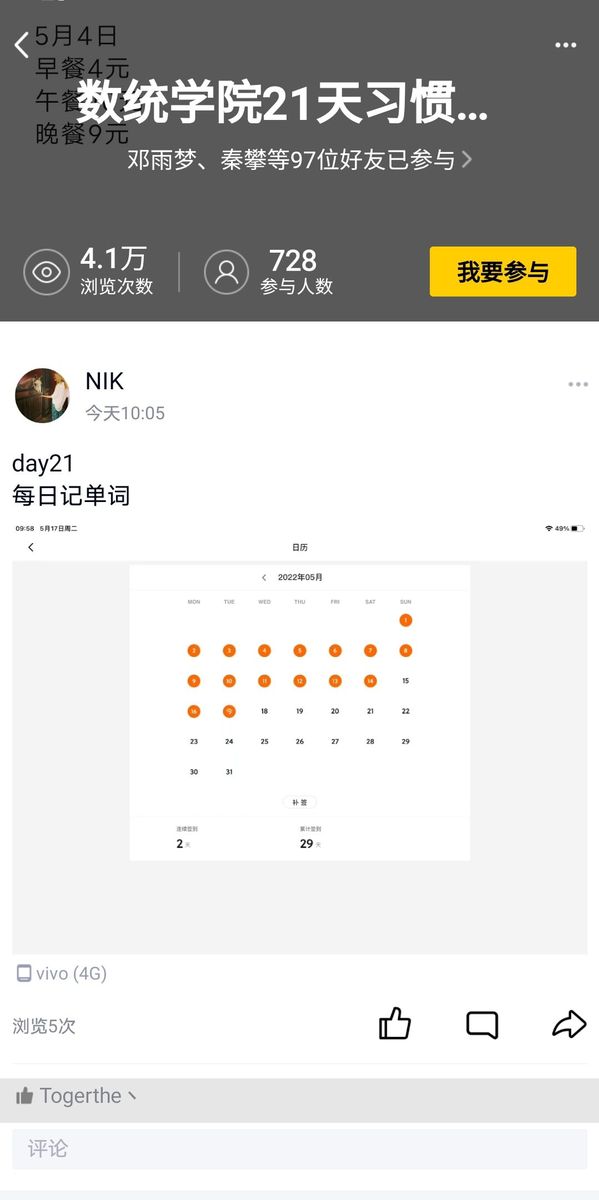 本次活动,公司采取带话题发说说的方式进行,同学们每日将打卡动态公开发布至QQ空间即可。活动中,同学们积极参与,记录学习,分享美景,规律饮食,健康生活,每日按时按量进行打卡。在公司创建的话题内,同学们互相督促、互相学习,圆满完成了21天习惯养成打卡。21天的打卡是数统学子的坚持,各种各样的打卡内容是数统学子的收获,打卡不仅仅是对自己的坚持,也可以号召其他小伙伴一起参与打卡,共同进步,共同收获。