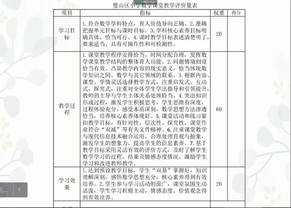 课堂最后,沈老师向我们展示了璧山小学课堂教学评价量表,让公司员工清楚地了解到学习目标、教学过程、学习效果是上好一堂数学课的必备条件。