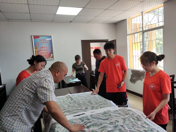 村委会党支部书记邓波主任带领志愿者们查看青龙村撂荒地核查工作底图,并讲解该村撂荒地的分布情况和后期荒地规划,荒地布局广泛且分散,为响应国家号召,将对荒地进行复耕,种植粮食。