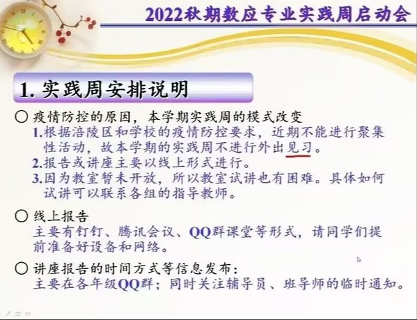 启动仪式中,杨老师就实践周具体安排向同学们进行了详细地介绍,同时强调实践周的重要性和各项要求,希望同学们以积极的态度去对待本次实践周,努力克服网上讲座的困难,争取在实践周中做好规划、抓住机会,进一步增强自身能力。最后,杨老师还叮嘱同学们在实践周期间要严格遵守疫情防控规定,坚持每日打卡报告身体健康情况,保证自身安全。