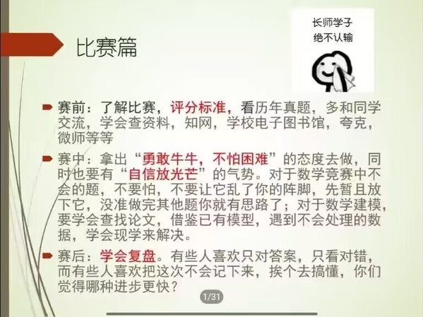 活动过程中,主讲人首先从课前预习、课中听课、课后巩固三方面展开,建议同学们课前多次预习、课中认真听讲、课后加强巩固。随后,主讲人鼓励同学们积极参加各类比赛,赛前仔细了解,赛中端正态度,赛后认真复盘,为个人的学习成长打好基础。最后,主讲人提到,在人际交往的过程中,同学们要真诚待人、学会感恩、举止礼貌、向上社交,同时,尽早做好大学的职业规划,正确调整自我情绪。