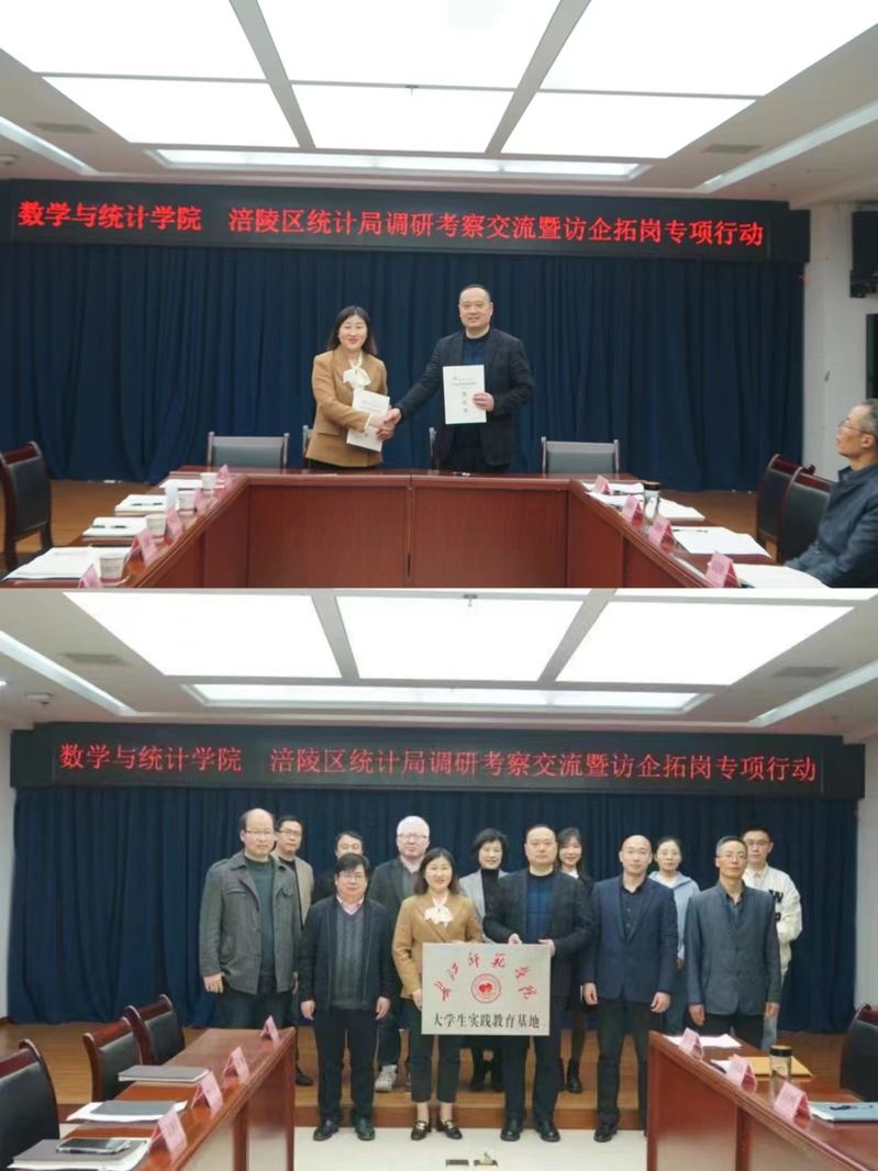 涪陵区统计局党组书记、局长张浩特结合统计局各专业组的工作内容和特色介绍了涪陵区统计局相关工作,委书记袁娅玲介绍了学院历史沿革、专业发展、团队队伍、学科科研。双方就应用统计学培养方案修订、校地项目合作、员工实习实践及就业等进行深入座谈交流,并签订校地合作框架协议,同时举行了老员工实践教育基地授牌仪式。