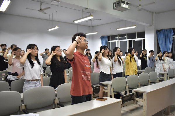 大会严格按照预备党员转正议程进行。会中,杨雪敏、熊莉、庞雯文等十位预备党员相继向党组织递交转正申请书并进行发言,汇报自己在预备期一年内的学习、生活、工作、思想等情况。紧接着,预备党员的转正第一、第二介绍人分别向党组织介绍其作为预备党员一年的教育考察情况,并由其他同志补充发表意见。在预备党员本人表态后,由党支部正式党员对预备党员能否转正进行充分讨论与投票表决。最终,杨雪敏、熊莉、庞雯文等十位同志全票通过表决,按期转正。最后,全体成员右手握拳高举过肩在鲜艳的党旗下庄严宣誓。