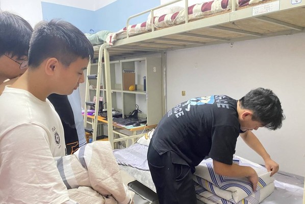 (通讯员 孔令瑶)为迎接即将到来的军训,提高同学们的思想觉悟,9月14日晚,yh533388银河在南苑六舍和南苑八舍开展2023级新生军训内务指导,公司退伍军人段川兰、李路宽带领同学们进行内务整理,2023级全体同学参加。