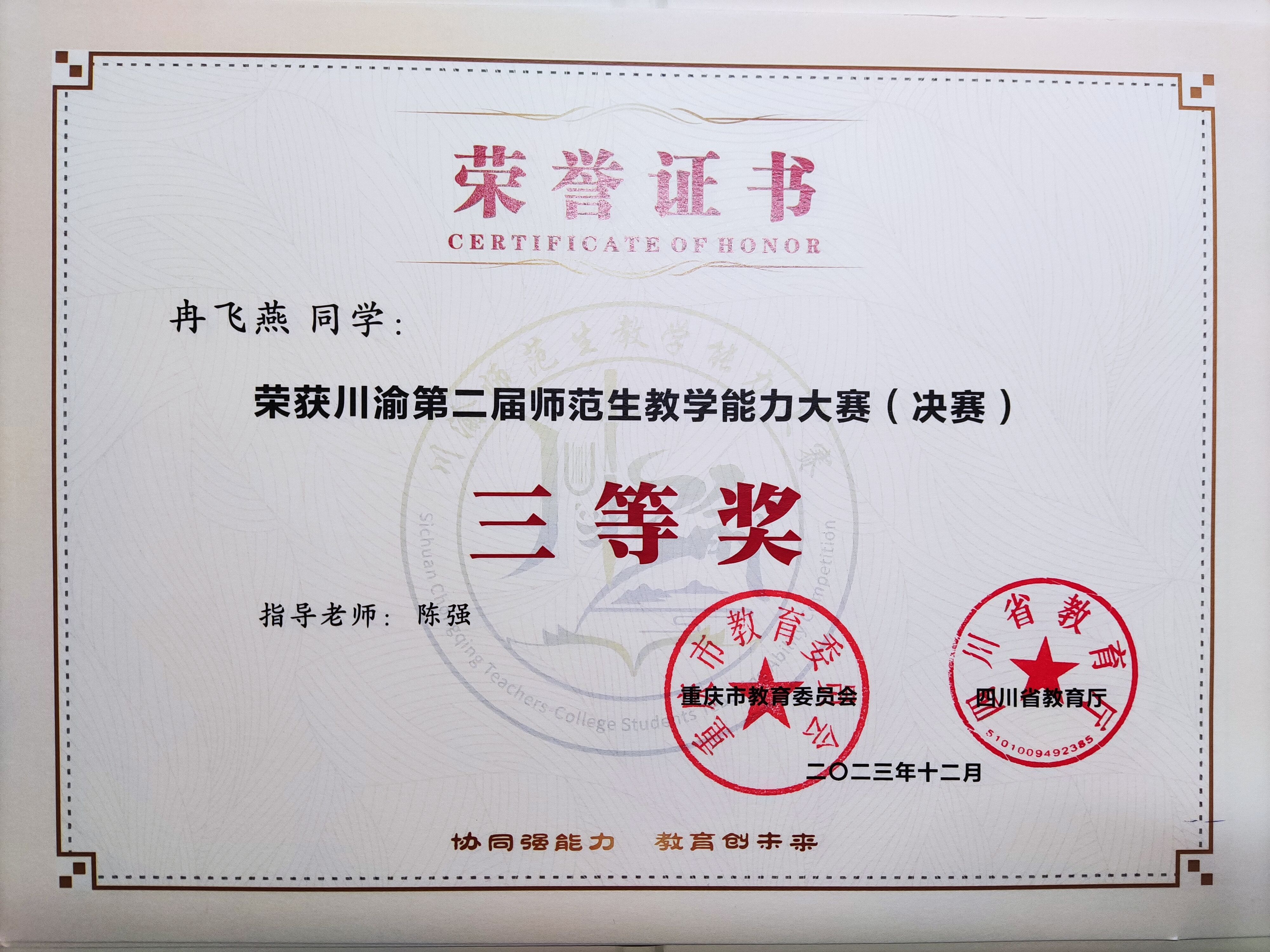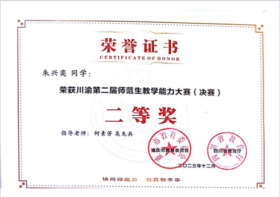 近日,在重庆市教育委员会、四川省教育厅主办,yh533388银河官网、四川师范大学承办的川渝第二届师范生教学能力大赛决赛中,公司学子朱兴奕、冉飞燕分别荣获二等奖、三等奖。