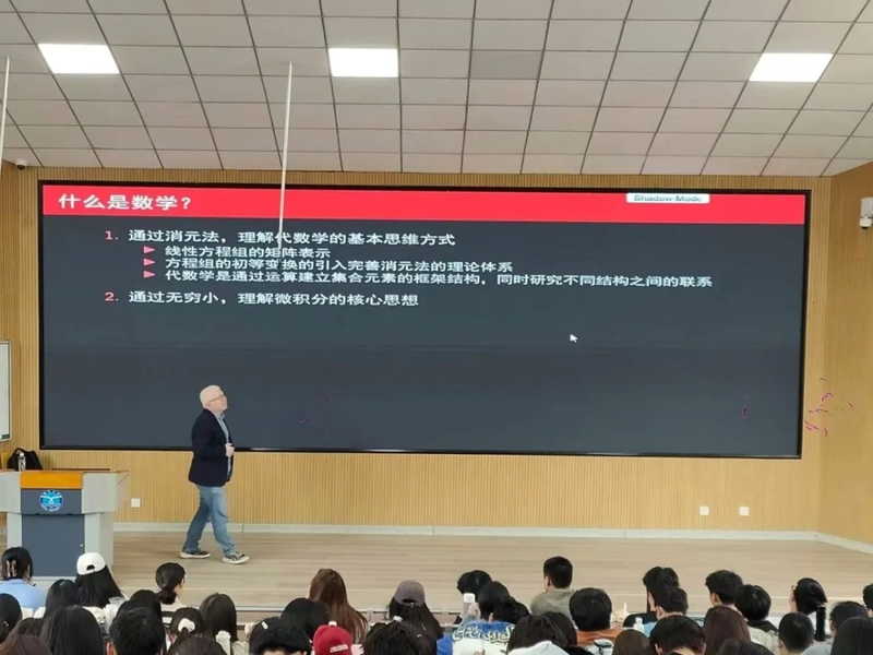 讲座中,杨老师以我国著名数学家陈景润在解决哥德巴赫猜想方面所做的突出贡献为切入点讲解了与数学相识的方式以及解决数学问题的过程。随后,他深入浅出地从“通过消元法,理解代数学的基本思维方式”“通过无穷小,理解微积分的核心思想”“通过人工智能和 AI,理解现代数学发展方向”“通过图论理论的建立,理解数学理论发展的源动力”四个方面带领同学们认识了数学这一科学领域。最后,针对怎样才能学好数学,他向同学们提出了“夯实基础、养好习惯、学会思考、善于总结、忍住折磨、拓展视野、远大目标”等七点建议,并希望同学们要做好大学学习的规划和目标,要用高目标“带动”自己进步。
