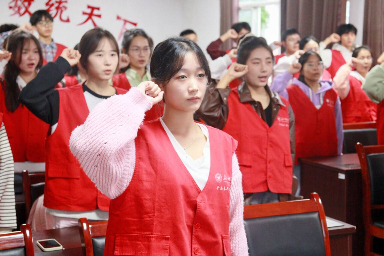随后,志愿者代表带领全体成员庄严宣誓,并进进行旗帜交接。最后,青年志愿者服务团的同学们给志愿者们留下了自由提问的时间,热情为志愿者们答疑解惑,并给予同学们衷心的祝愿。