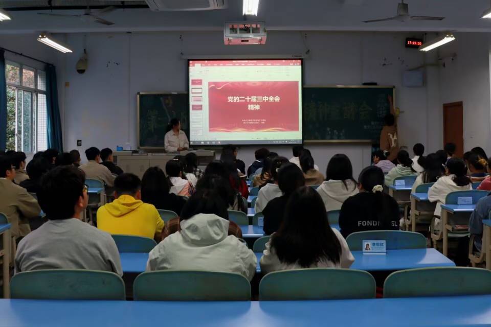 宣讲伊始,刘婧从党的二十届三中全会的重要意义出发,强调党的二十届三中全会是以中国式现代化全面推进强国建设、民族复兴伟业的关键时期召开的重要会议。接着她围绕“深入学习领会习近平总书记在党的二十届三中全会上的重要讲话精神”、“全面准确理解《决定》提出的进一步全面深化改革重大举措”、“贯通学习习近平总书记对重庆改革工作的系列重要指示要求,加快打造全面深化改革先行区”、“全力以赴抓好全会精神贯彻落实,对标高质量推进学校事业综合改革”等四个方面,对党的二十届三中全会进行深入解读。其中她重点强调了党的二十届三中全会精神为重庆的改革提供了强大的动力和指引。最后,主讲人鼓励同学们积极发挥青年担当作为,立志做有理想、敢担当、能吃苦、肯奋斗的新时代好青年。