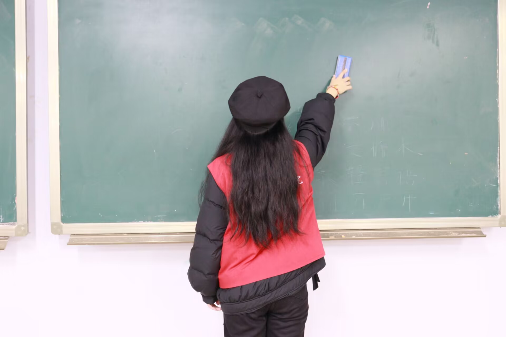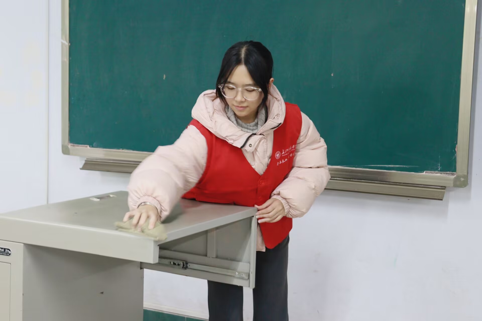 活动中,有的志愿者细心地清扫地面上的纸屑、灰尘,不放过任何一个角落,让地面重现光洁。有的志愿者则认真擦拭黑板、讲台和桌椅,确保每一处都一尘不染,为老师们的授课和同学们的学习提供了干净整洁的条件。大家分工协作,忙而不乱,劳动的身影穿梭在教室的各个角落里。经过他们的辛勤劳动,原本略显杂乱的教室变得焕然一新,干净整洁的环境让人心情格外舒畅。