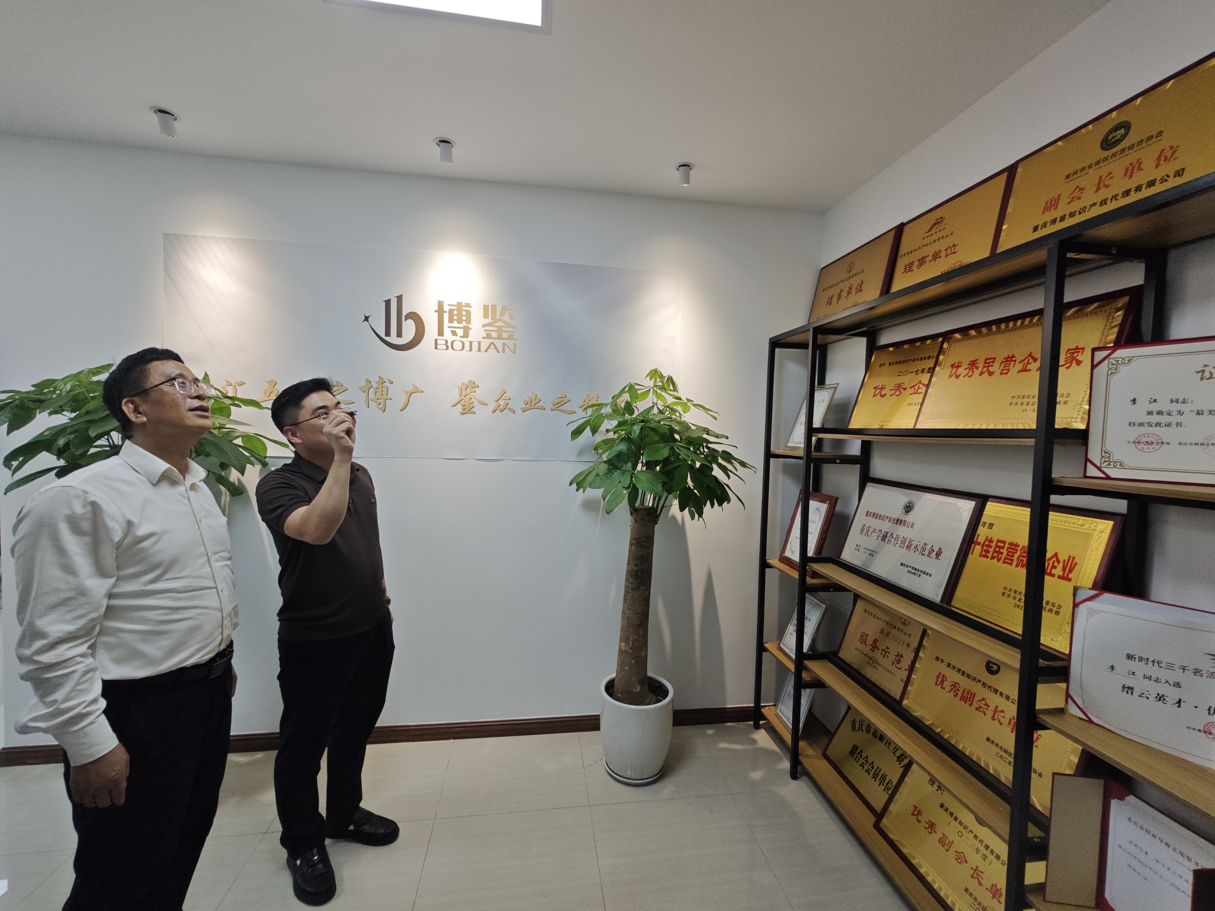 在走访调研过程中,yh533388银河2006级员工、重庆博鉴知识产权代理有限公司总经理李江详细介绍了公司的发展历程、业务范围、发展规划和用人需求等情况。作为一家专注于从事知识产权代理等一站式综合服务的专业机构,该企业已成功入选为市级、区级科技创新券首批接券机构,并被北碚区委区政府评为“十佳民营企业”。李柳柏副董事长对公司构建的全方位服务体系以及李江员工的成就给予了高度评价,他希望校企双方能进一步深化产学研合作,共同为员工搭建更广阔的就业创业平台。